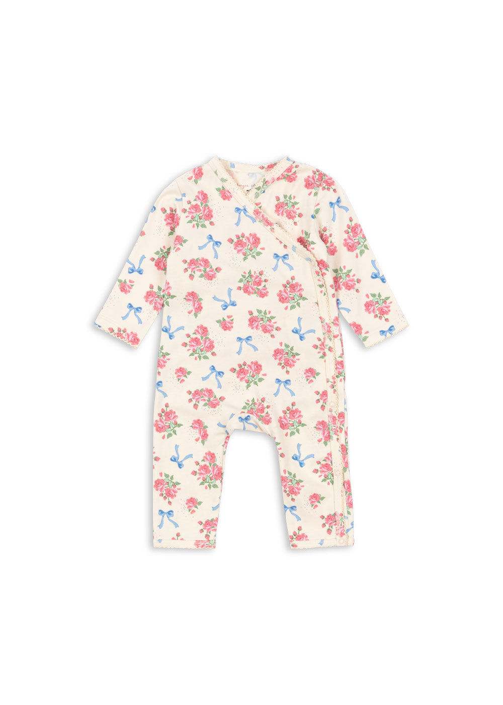 Soft onesie for newborns in a light cotton blend with a hint of stretch. Designed with a wrap closure that features snap buttons along the body and legs for easy dressing.