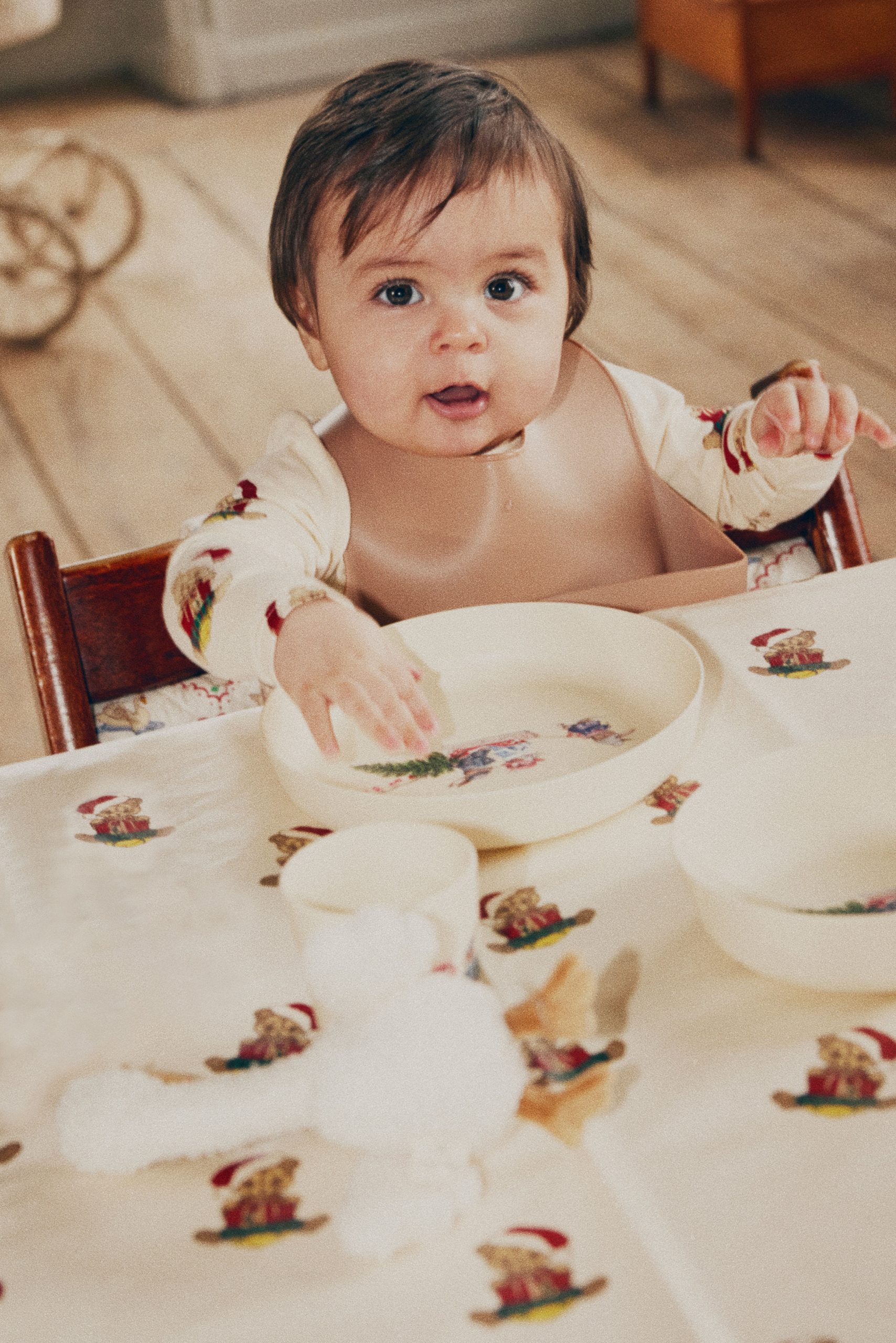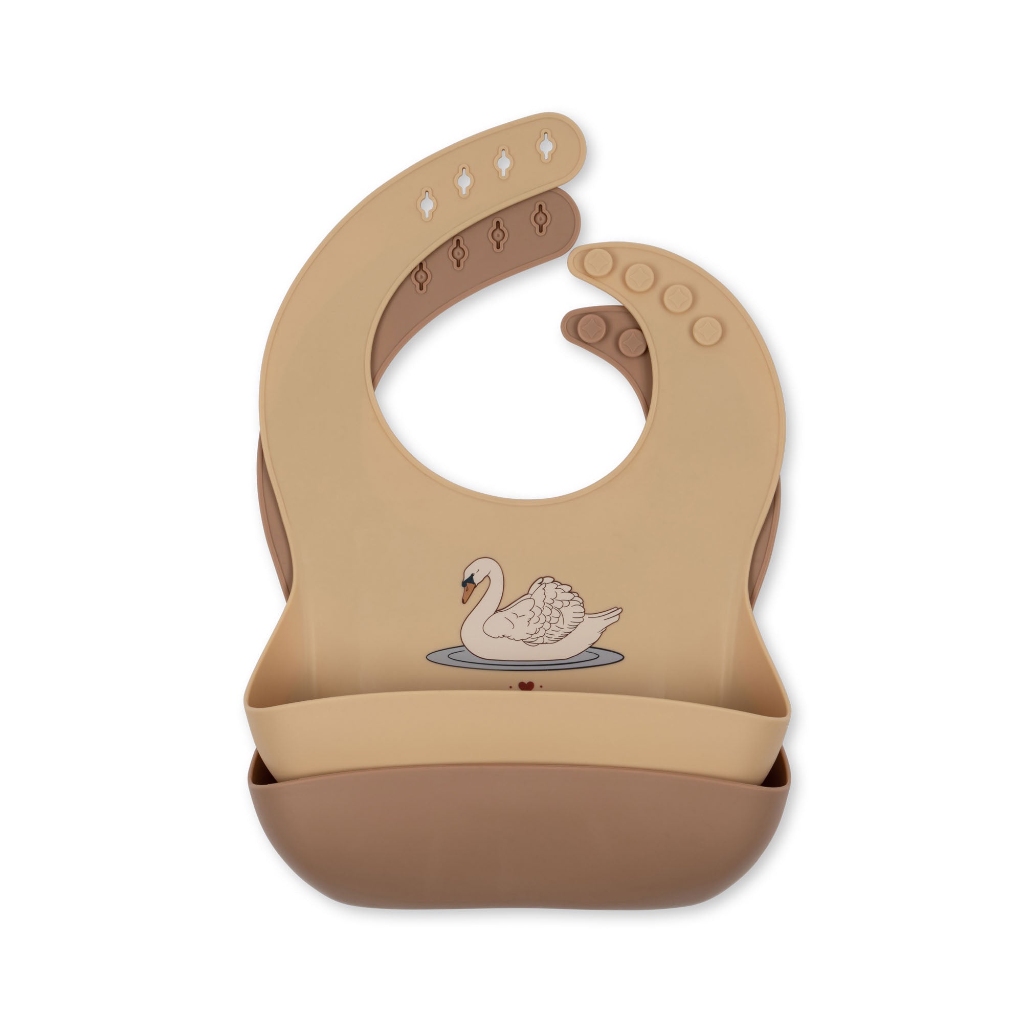 Dinner bib with a practical front ‘pocket’ that scoops up the mess during meal time