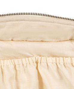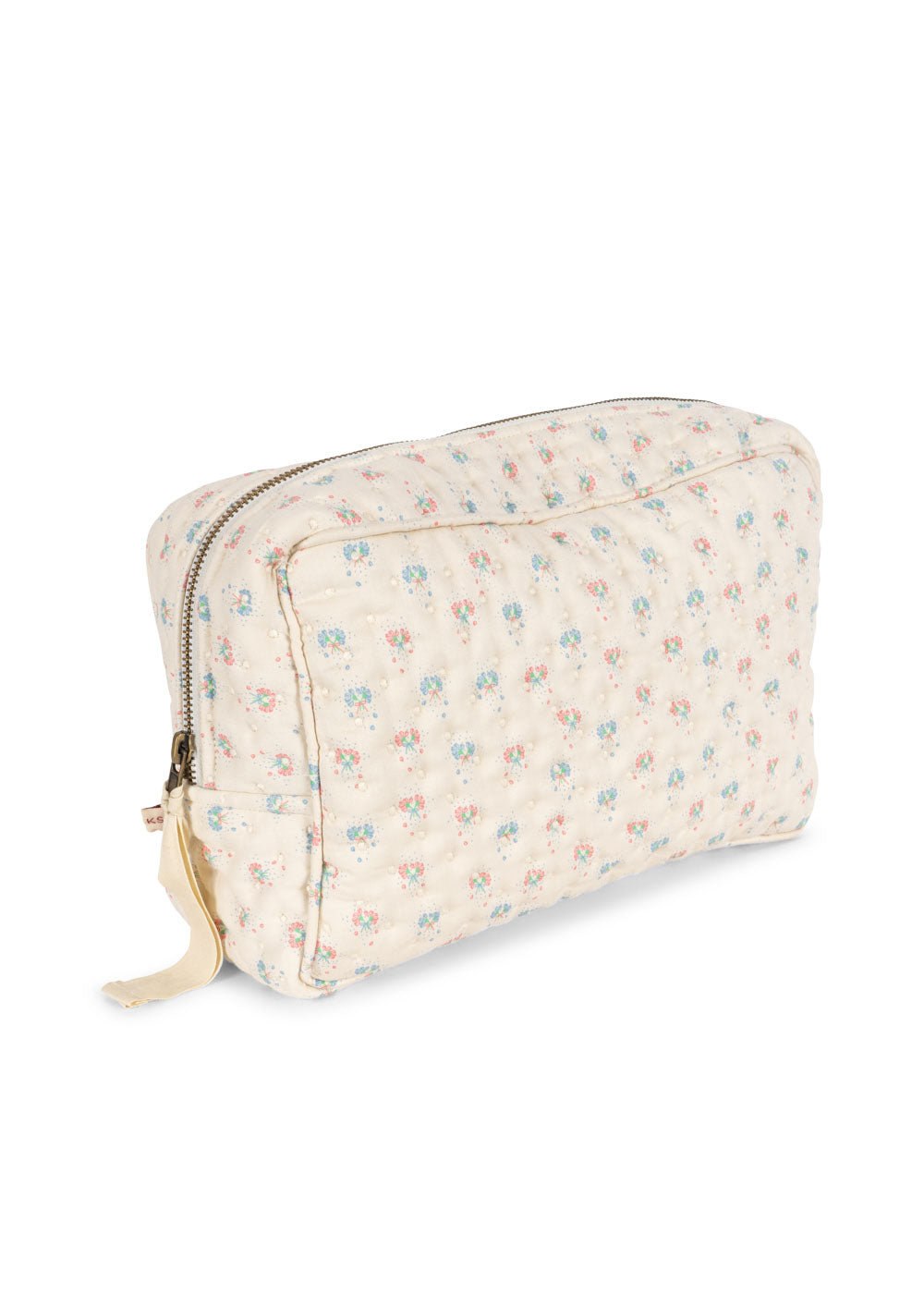 Large quilted toiletry bag designed with one big compartment and a small inside pocket. It is softly padded in order to keep your essentials safe. Closes with a zipper.