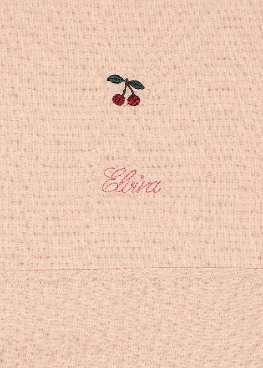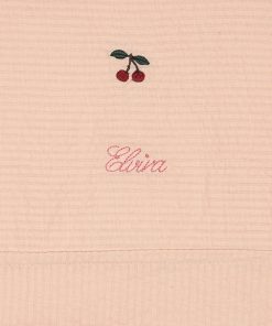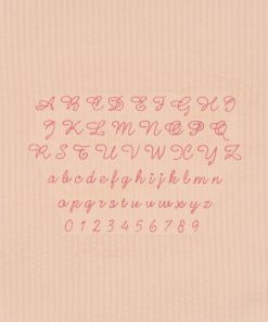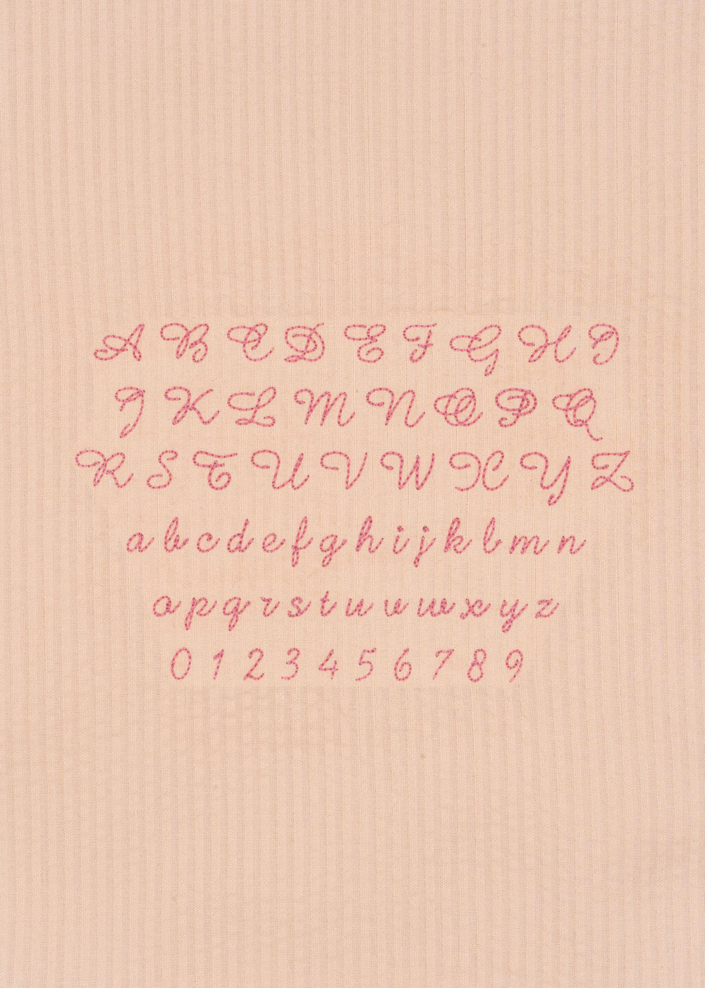 Please note that the name is embroidered in italics and that individual letters will appear with a “connecting line” to the rest of the name. You can see how the letters are written in the picture below the bedding.