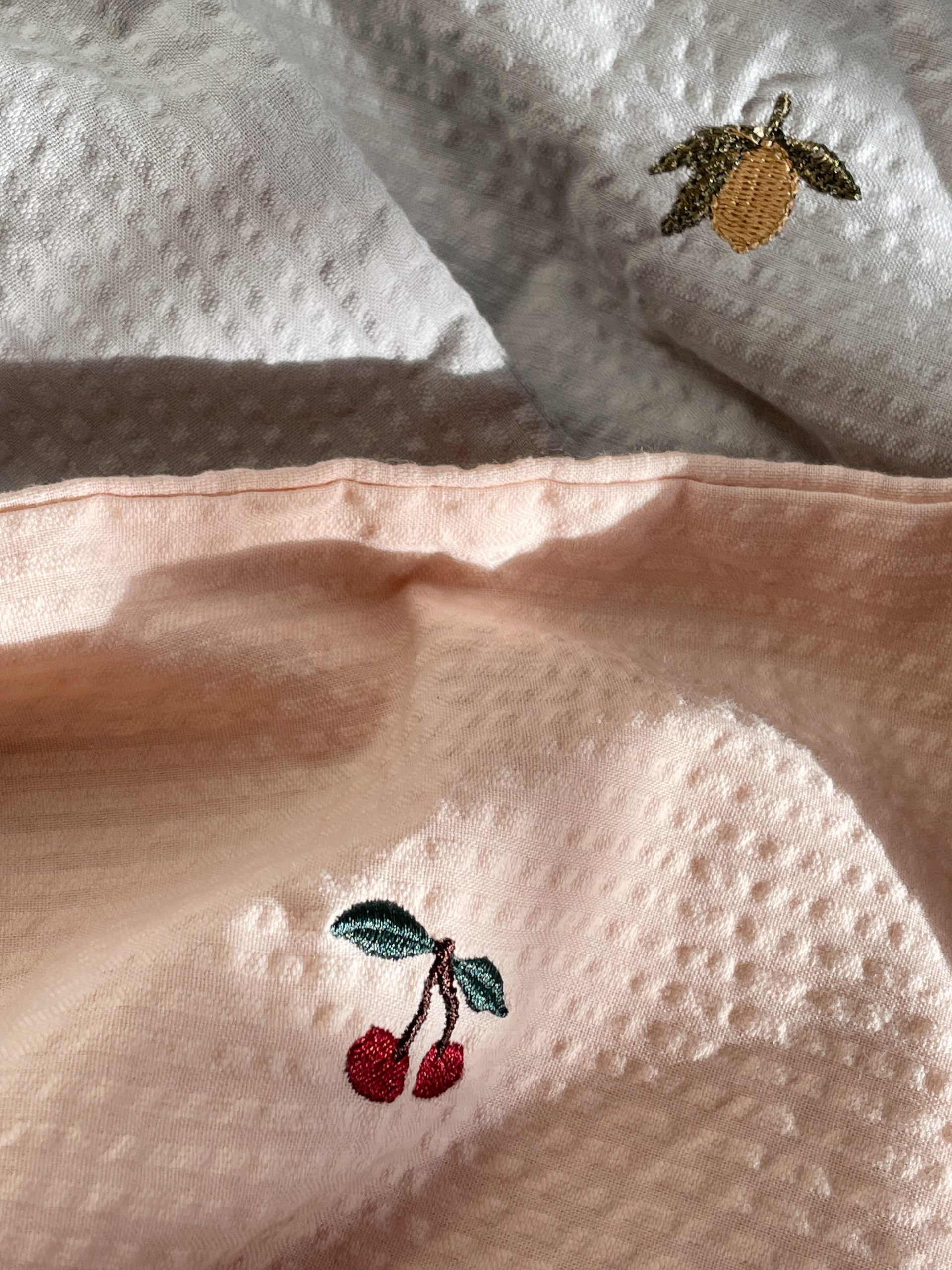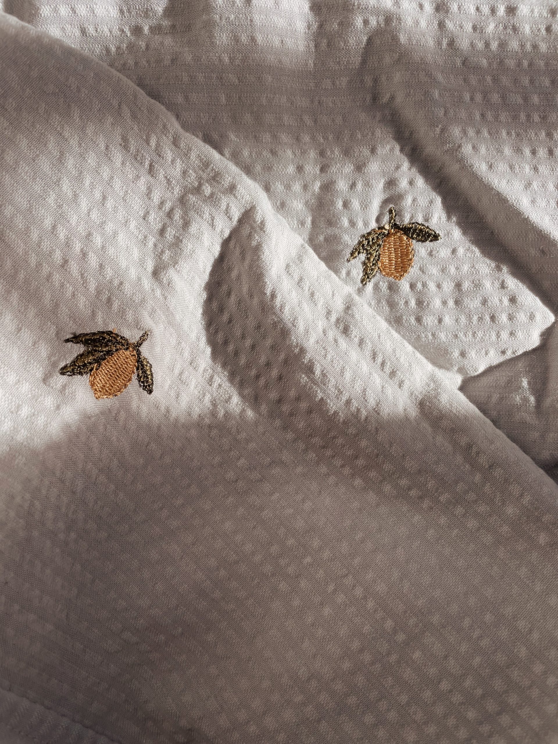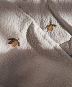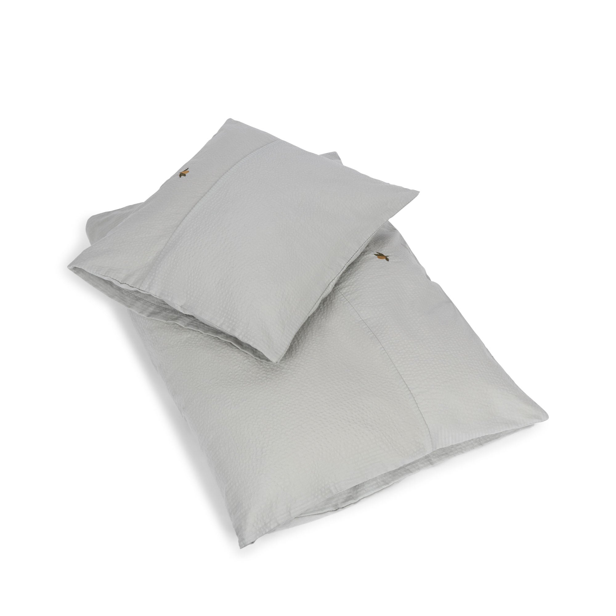 Soft bedding made from textured seersucker cotton that has a comfortable weight and feel. Features a matching duvet cover with a decorative embroidery and a pillow case. The duvet closes with a zipper.