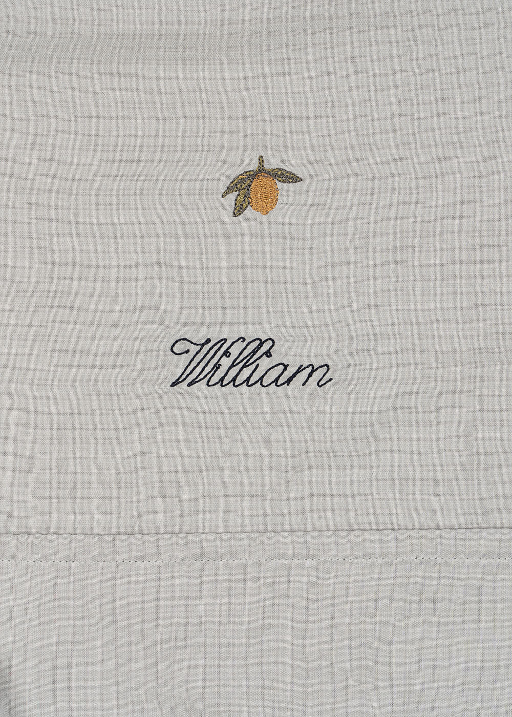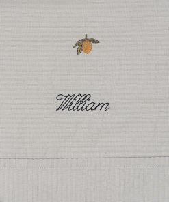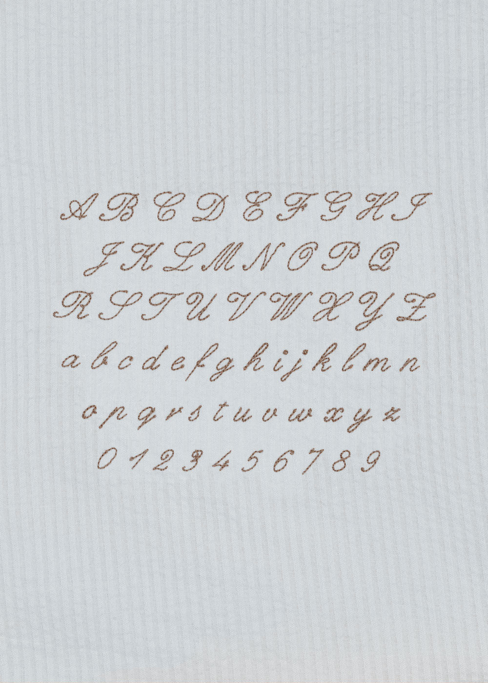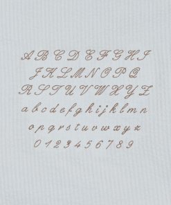 Please note that the name is embroidered in italics and that individual letters will appear with a “connecting line” to the rest of the name. You can see how the letters are written in the picture below the bedding.