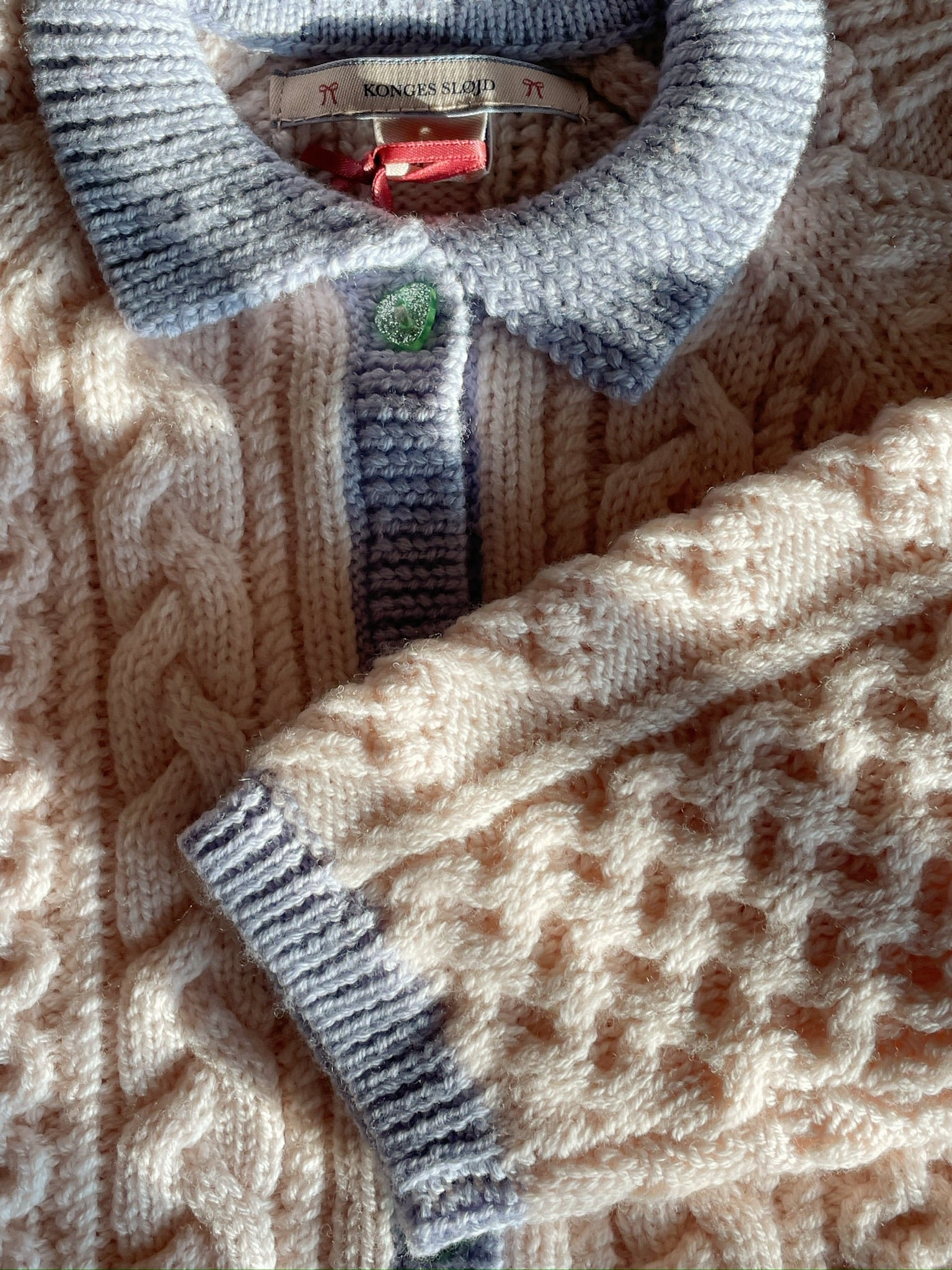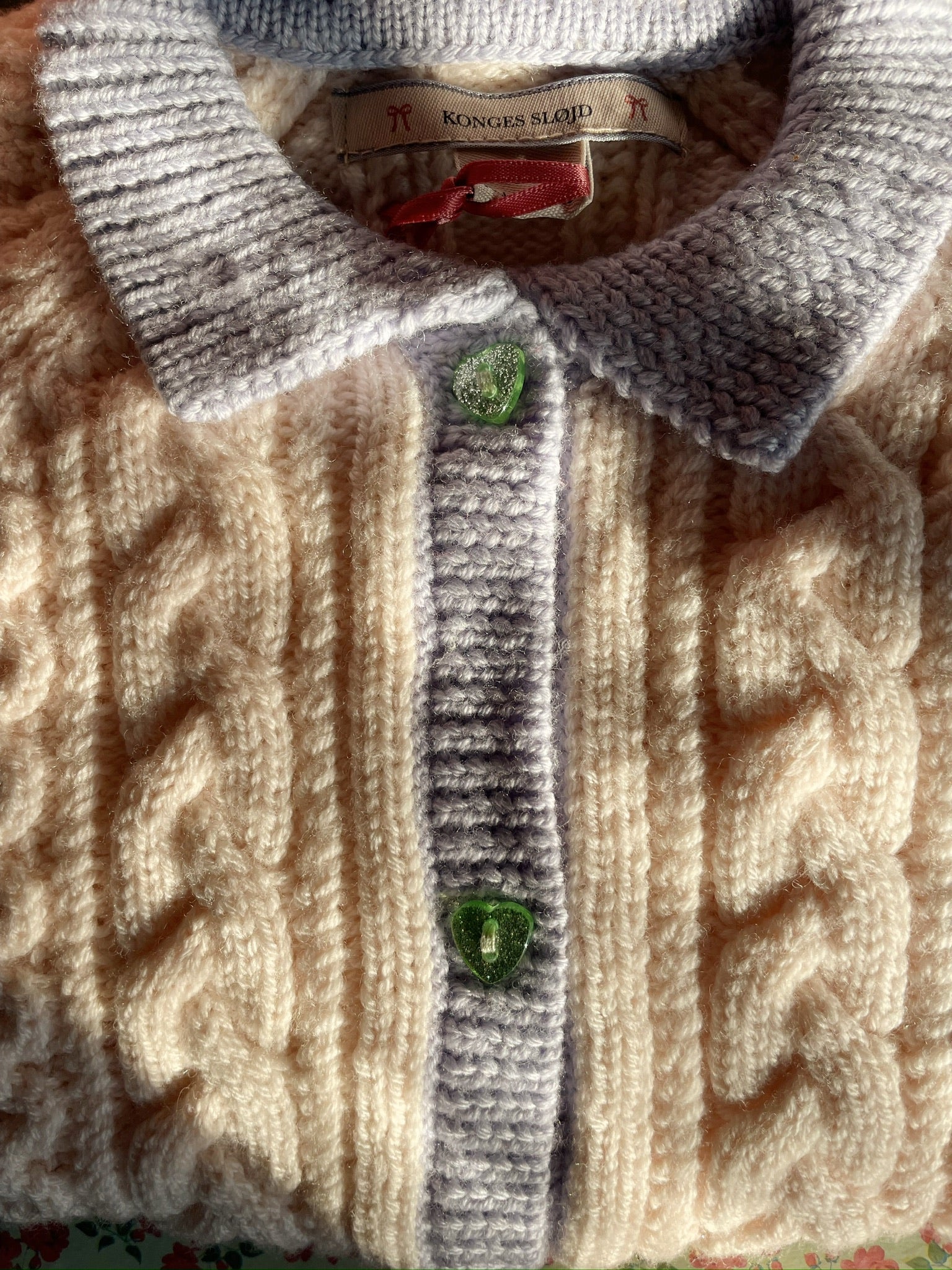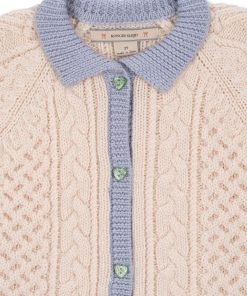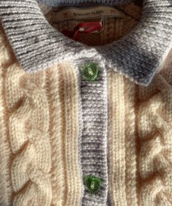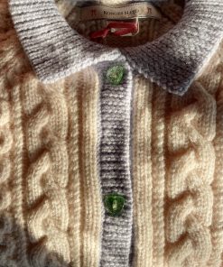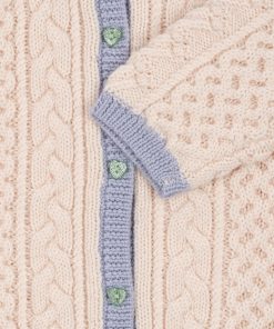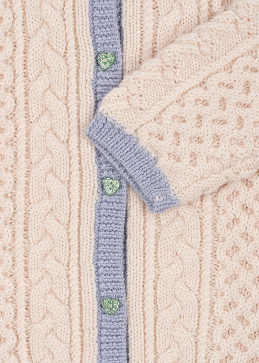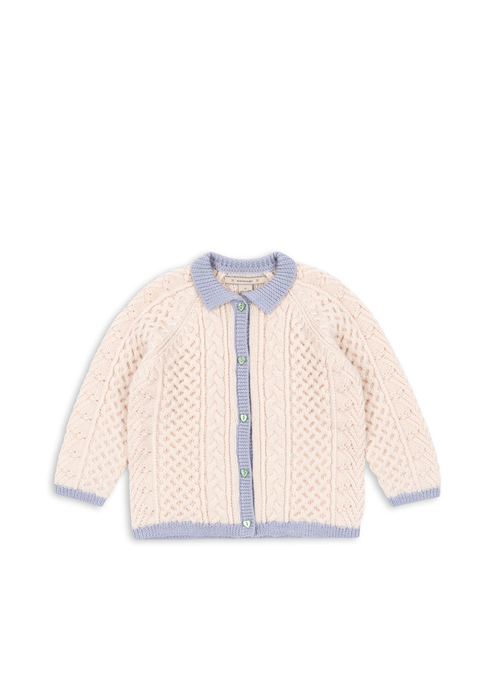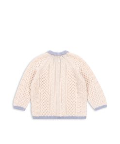 A fine merino wool cardigan in a delicate cable knit pattern that adds a classic look. Finished with heart-shaped buttons, rib edges, and a regular collar.