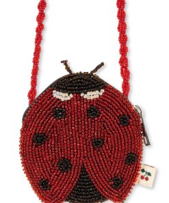 Handmade beaded bag shaped like a little ladybug. Designed with a slim shoulder strap made from glass beads and a sturdy zipper closure that is easy for little hands to open and close.
