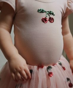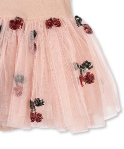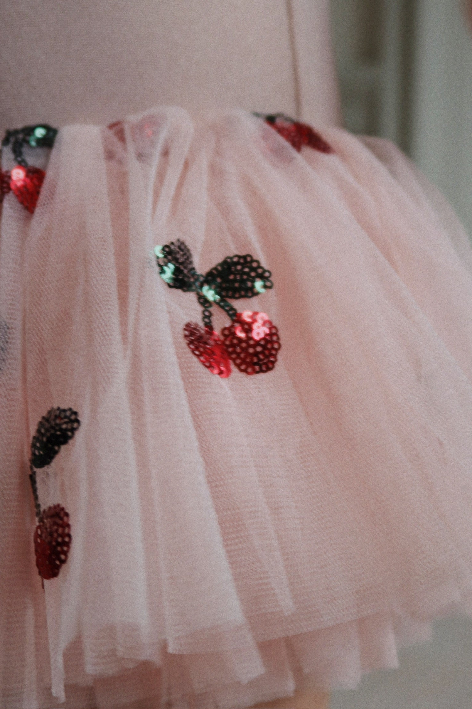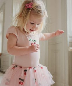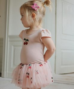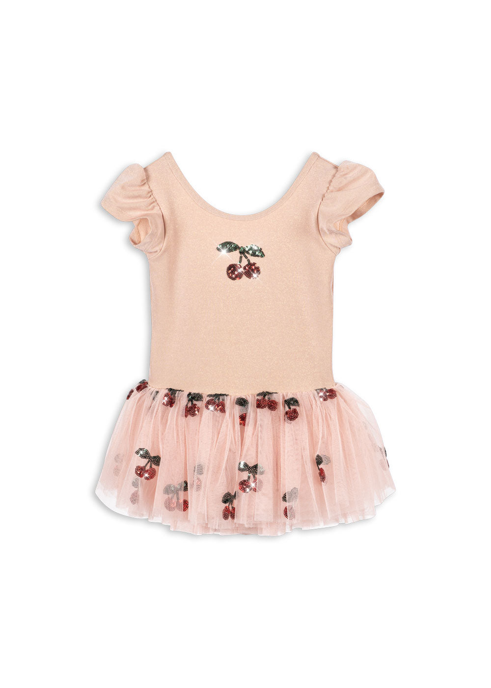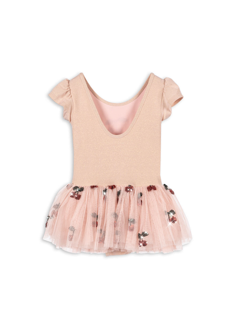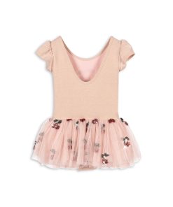 Classic tutu dress for little ballerinas with a low scoop back and puff sleeves. Designed with a voluminous tulle skirt that is attached to a fitted suit in a stretchy performance fabric.