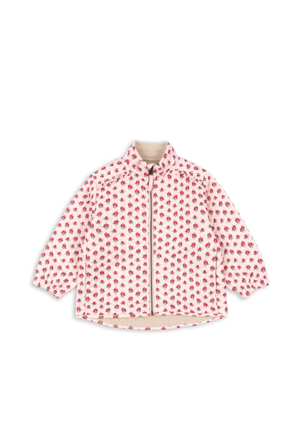 Warm and comfy thermo jacket with soft inside fleece lining and practical storm cuffs. Designed with a raised collar, side pockets, frill detailing, and sturdy zipper closure. A trusted companion for everyday wear in daycare, kindergarten or school.