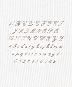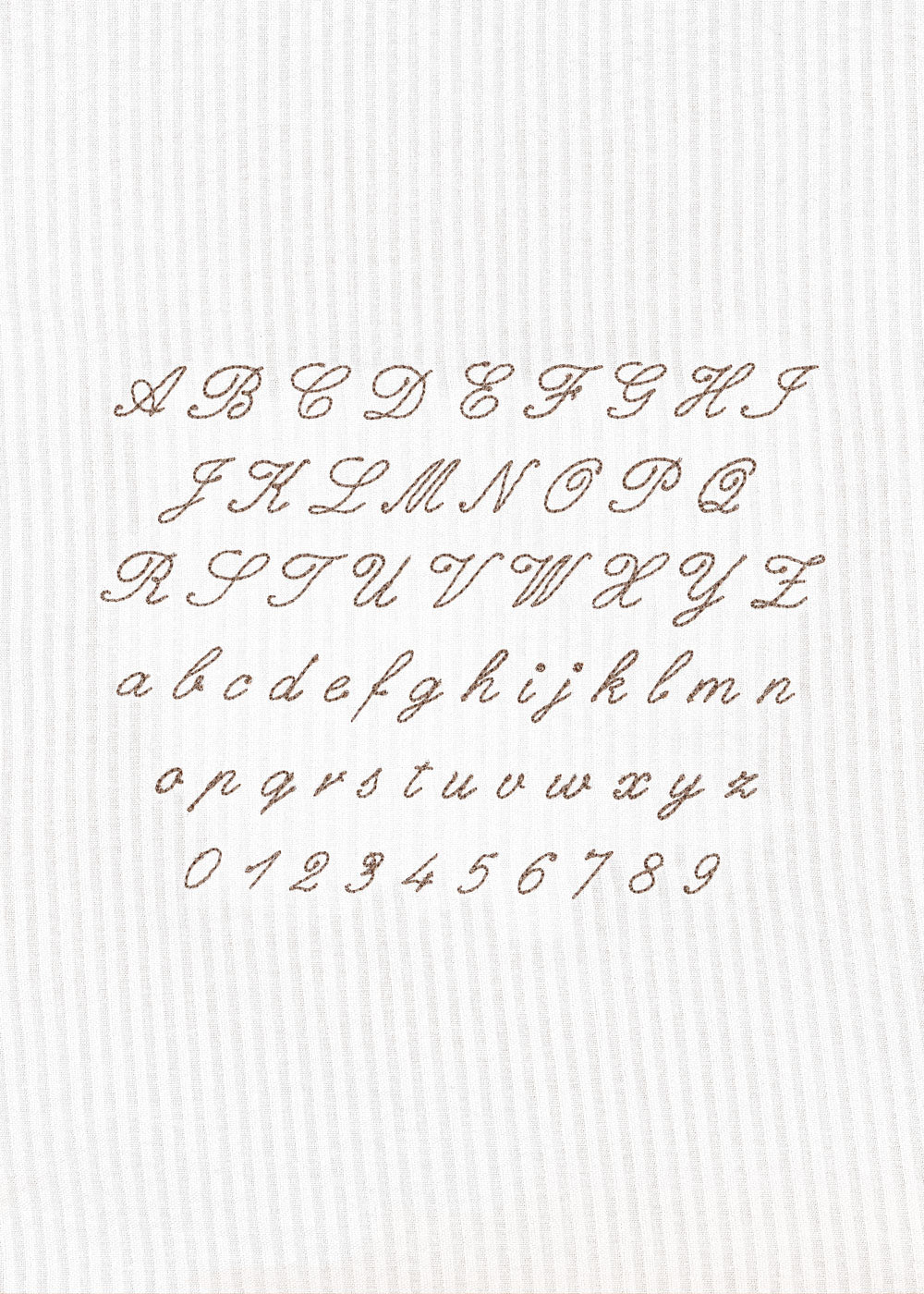 Please note that the name is embroidered in italics and that individual letters will appear with a “connecting line” to the rest of the name. You can see how the letters are written in the picture below the bedding.